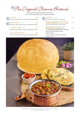 JAIN CHANNA 550 SPINACH BHATURA 160 Portion: 360 gms, Calories: 157/100 gms, Allergens: Dairy & Nuts