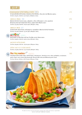 Portion: 290 gms, Calories: 216/100 gms, Allergens: Dairy cheese and mozzarella cheese, seasoned with Mexican spices. Served with guacamole and sour cream.
