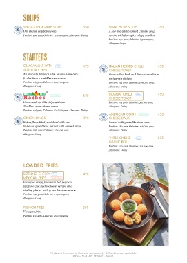 Homemade tortilla chips with our Portion: 165 gms, Calories: 39/100 gms, Portion: 250 gms, Calories: 273/100 gms, Allergens: Dairy, Portion: 240 gms, Calories: 224/100 gms,